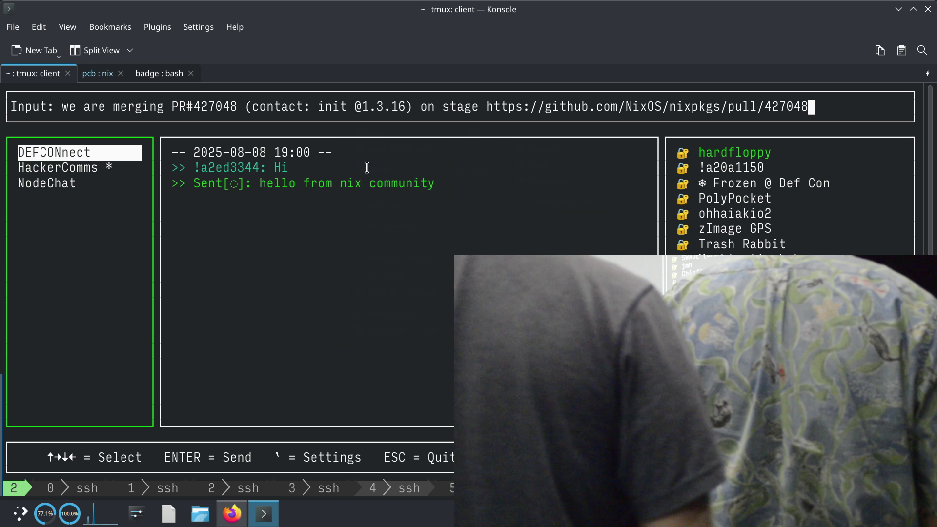 One of the coolest PRs we merged onstage was #427048 for Contact. In addition to being a Jodie Foster movie that helped get me into amateur radio in high school (and was fantastically sampled by Assemblage 23), it's also a console UI for Meshtastic. We actually tested it by plugging a terminal into our build machine and getting on the DEF CON Meshtastic mesh. LGTM!