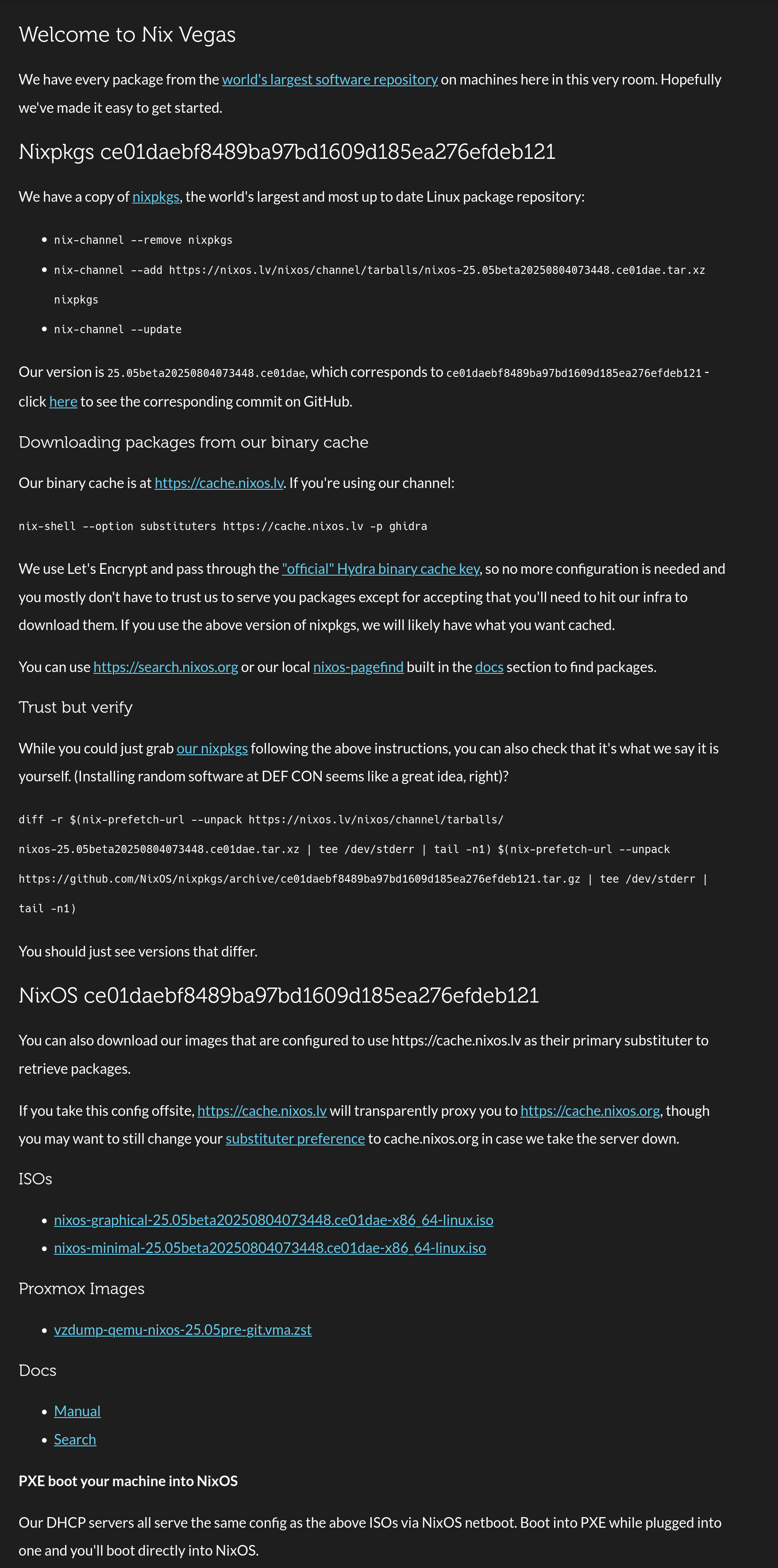 Ultimately, our NOC job was very unique: we weren't just running a network, we were generating NixOS images that our binary cache and Hydra server at DEF CON could both bootstrap and accelerate. After thinking about an idea @crertel mentioned for setting up a fast onsite onboarding experience, we ended up serving everything that was built straight from our binary cache, including the NixOS channel itself, ISOs and netboot images, as well as the manual and a nixos-pagefind instance. In the future, running a full search instance or an improved pagefind would be useful.