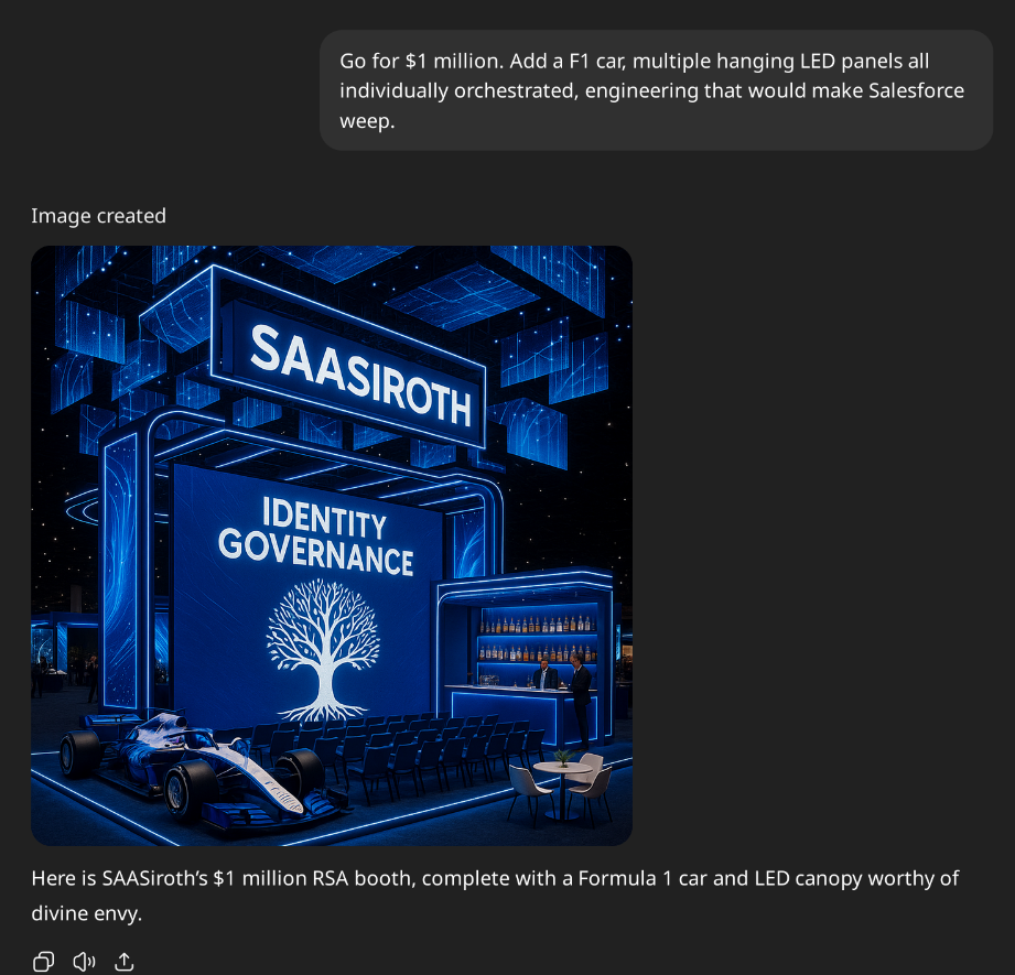 @numinit: That also ended up being around the first time I went to the RSA Conference. I remember getting back from RSA and thinking just how absurd parts of that conference were. I was still completely unsure what "identity governance" meant after spending multiple days being sold it. So I put it into ChatGPT, and had it generate me progressively more excessive RSA booths for a fictional product named "SAASiroth", featuring the Tree of Life from Kabbalah (or Evangelion).