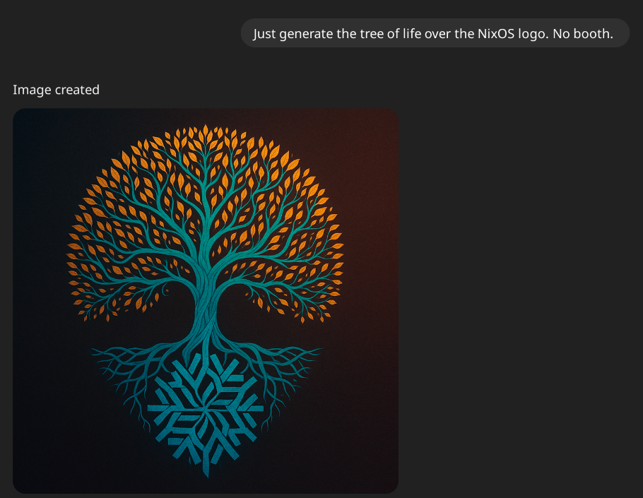 @numinit: Lying in bed on a family trip to Long Beach, I had it generate (also obviously absurd) NixOS RSA booths following the same theme. One of the gens ended up accidentally intertwining the roots of the tree with a mangled version of the NixOS flake logo. But, wait, this seemed like it could have potential! Instead of picking the Tree of Life, it picked Yggdrasil, the World Tree! Alpine Linux has the "world file", and Gentoo has @world. There's even the Yggdrasil Network, a recent mesh VPN.